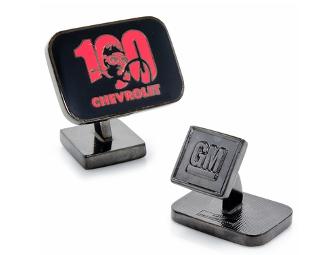 Commemorating 100 Years of Chevrolet, these Gunmetal Centennial Cufflinks are painted with "Carbon Flash" black enamel and feature a fixed back closure, showcasing the GM logo. A tribute to race car driver turned Enterpreneur Louis Chevrolet! Perfect for the life-long Chevy Fan. Measures approx. 3/4" x 1/2". Sold as a pair. Plated Base Metal, Gunmetal Finish & Enamel.