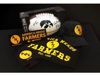 Package includes an football autographed by Hayden Fry and Coach Kirk Fernetz, ANF T-shirt, ANF ball cap, car magnet and koozie.