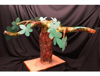 This artist papier-mache take on an African tree stands approximately 24" tall on a 12"x18" base. Each leaf was created by the students and holds their names. A whimsical piece to add to a tabletop or large mantle.