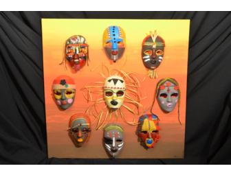 A striking piece of art for your home! A 24"x24" square canvas is decorated with masks designed, painted, and decorated by the students. These bright designs and bold colors combine to create a piece that's sure to be noticed!