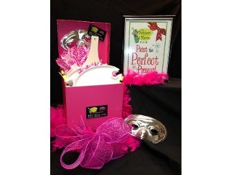 Take the pieces in the basket to the studio to create something fun and colorful. The studio has more than 100 paints and glazes to choose from. Stencils and transfers are supplied. Everyone's an artist! Once your pieces are painted, leave them at the studio while they are glazed and fired.