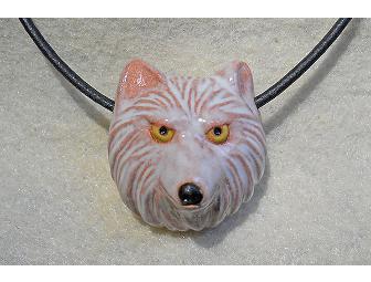 This ceramic wolf pendant is handcrafted by artist Lu Mellado out of Nevada City, CA.