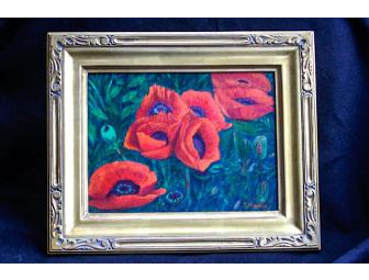 A richly hued palette and lush brush strokes bring the bouquet of Poppies to vivid life in a stunning oil on canvas painting from local artist June Munro's series of Floral Still Lifes. Munro has traveled all over the world, exploring the world of art through making and collecting works. She was most recently featured in the Summer Issue of North Shore Living East and West, June 2010. June's truest passion lies in the medium of oil on canvas. She explains, "My style keeps evolving and I have yet to settle on one particular style. The painting seems to dictate the outcome. June is an artist member of the National Association of Women Artists in NYC, Newburyport Art Association, the Concord Art Association, and the Cambridge Art Association, and is an associate member of the North Shore and the Rockport Art Associations and the Boston Artist Guild. She has served as Vice-President and Scholardhip Chair of the Andovers Artists Guild and continues to participate as a Board Member of the Guild.