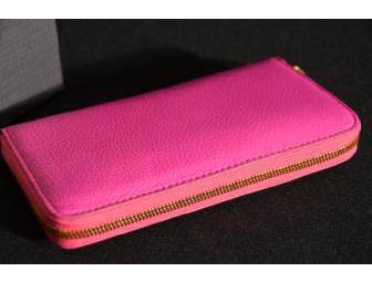 Enjoy a little extra burst of color with the promise of spring with this pretty pink leather wallet with orange interior.  A nice gold zipper detail finishes this cute look from J. Crew.