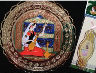 Gold metal decorative dish approximately 6" in diameter, featuring enameled design of a Middle Eastern woman playing a stringed instrument; camel motif in background