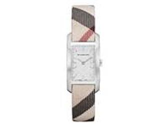 This lovely ladies watch features the classic Burberry pattern with a stainless steel rectangular frame, Swiss precision, and quartz movement.
