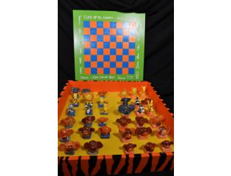 This 18" square chess board and individually sculpted figurines make for a fantastic set with which to play. The board is painted in blues, oranges, and greens, with a tiger stripe border. The pieces are all of the animals of the serengeti. Get ready to play!
