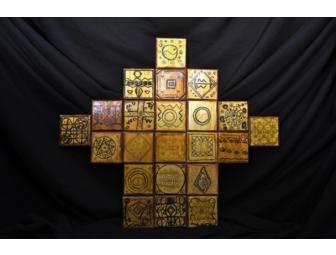 This unique piece combines individual canvases painted by each student to resemble traditional African symbols. They are assembled into a 24"x24" cross with a plexiglass backing. This neutral colored piece will be an great addition to any room.