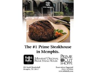 Folk's Folly is a Memphis tradition for the finest prime steaks and fresh seafood. Consistently voted "Best Steak" by Memphians in virtually every restaurant poll, Folk's Folly pairs fine dining with a cozy, comforable atmosphere. This gift certificate will allow you to enjoy a true dining experience!