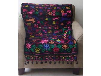 From Southern Mexico or Guatemalan highlands. Approximately 44 x 100 inches. Hand woven wool with hand embroidered design. Very colorful, probably from 1990s. Excellent condition.