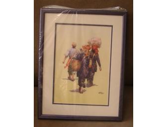 Measures 7.5 x 10.5 inches in the frame. Acquired in Myanamar in 2012. Scene portrays local people in native costumes on the way to the market. Created by local artist selling from stall in market of town of Kalaw. Museum quality framing done in Albuquerque.