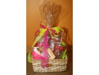 Think Pink spa basket with tumberl, art work, journal, lotion, and relaxing music.