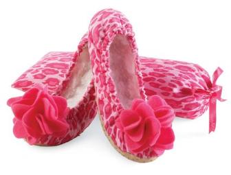 Leopard Love Ballet Slipper: Cotton slipper features pink animal pattern, plush lining and pink felt flower. Comes complete with matching drawstring carry pouch.