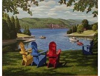 This painting is the most recognized view from the Basin Harbor Club. Painted in 1999 as a commission, this is the view from the back deck of the main lodge. The relaxation is captured in the four empty chairs beckoning the viewer to have a seat. The guests at the resort are very familiar with this view of the harbor as there is seldom a time that these chairs are empty.