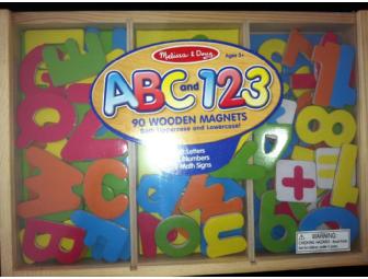The Melissa & Doug Letter, Number, and Math Signs set is a 90-piece wooden magnet set that features 52 letters (both upper and lower case), 33 numbers, and 5 math signs.