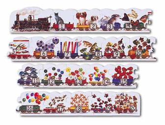 This train puzzle has your number! Easy to assemble, this colorful cardboard jigsaw from Melissa & Doug features a powerful steam engine hauling 21 cars full of things to count. This handsome puzzle reaches nine feet long, and features 21 extra-thick pieces with an easy-clean surface to keep them looking like new.
