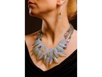 Labodonite & calcedony with silver twig spacers & kyanite with sterling silver peacock clasp.