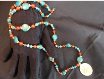 The large stones are Magnesite with Pyrite (Fool's Gold). The smaller turquoise stones are Aqua Terrine Jasper and the red ones are Carnelian. Spacers are vermil (sterling plated with 24K gold). The medal is red bronze depicting a child's first communion.