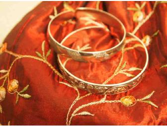 Two 1-cm wide Tibetan silver bangles, artistically inscribed with six Tibetan characters and said to purify the body, speech, and mind, as well as to bring good luck to the wearer.