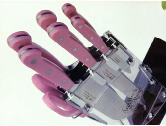 Pink, 8 piece cutlery set including chef knife, bread, utility, slicing, santoku, paring, multi-purpose, and multipurpose kitchen shears.