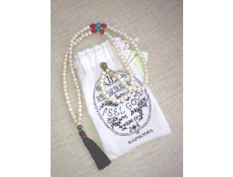 This Tibetan-style wooden bead necklace was made in Argentina.  It is approximately 36" long with cream, coral, and turquoise colored beads, and black tassel.