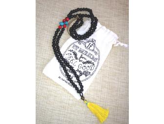 This Tibetan-style necklace was made in Argentina and is approximately 36" long with black, coral, and turquoise beads, and a yellow tassel.