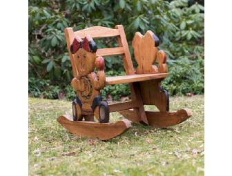 Handcrafted in Thailand, this child size rocking chair has beautiful carved detail. Measures 27"deep x 25" high x 19.5" wide. Seat is 14" high.