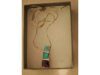 Silver chain necklace has mother-of-pearl 3/4" pendant with green and blue details. Gift box.
