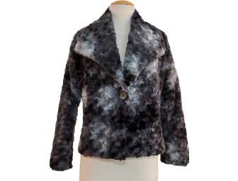 Rosebud tie-dye plush faux fur jacket in shades of grey. Jacket has a squared shawl collar, long sleeves and single button front. Unlined. Sits at high hip 100% polyester. Machine wash. Hang dry, fluff in no heat dryer.