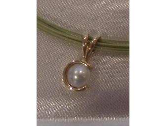 The beautiful necklace is a 14K yellow gold Chinese cultured pearl pendant on 16" light green steel 12-strand necklace.