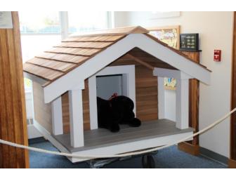Your dog will be the envy of the neighborhood with this amazing dog house. Bob Clark of The Ultimate Trim and Stairway Creations built this unique dog house which measures 3 ft x 4 ft including the 1 ft porch on front. Shepley Wood Products and SBS Lumber supplied the materials. This house is made with top quality products: Red Cedar shingles, Coma trim, 5 1/4" plastic decking, mahogany ceiling, and Red Cedar clapboard.