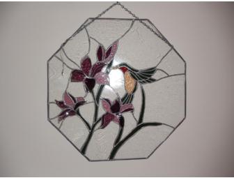 This beautiful 20" by 20" hummingbird stained glass will look beautiful in your home.