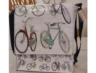 Vintage bicycles add style to this handy messenger bag made from recycled materials.