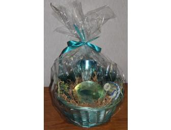 Set of 3 peacock plates, set of 18 peacock coasters, 1 bottle opener, candle holder, and 2 turquoise wine goblets.
