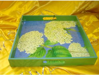 The art on this gorgeous tray was originally hand painted by Linda Funk, a botanical illustrator from Rockland, Maine. Linda is a master botanical illustrator and has won major awards, including the coveted Award for Excellence in Botanical Art from the American Society of Botanical Artists. The white hydrangea's on this 15" square tray are beautifully set on a blue background with green trim.