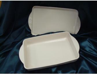 Serve in style using this Longaberger 9 x 13 Casserole dish. The woven traditions pattern is beautifully executed on this ivory colored dish and matching lid. The ceramic lid can also be used as a serving tray.