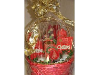 Two wine glasses one etched with "Joy", one etched with "Hope", two "Cheers" charm/tags, one bottle stopper, two candles with wreaths, 1 bag of Raspberry popcorn, & cork Christmas tree.