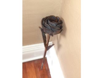 The handcrafted metal rose was made by Harrison County 4-H'er, Bobby Prucha. This metal rose is 22" tall with the flower being 5"x5". The rose is constructed of iron & rebar, created by an oxy-actaline torch. The petals were forced into shape using a flame & hammer. Half the proceeds from this rose will be returned to the Loess Hills Lancers 4-H Club in Harrison County.