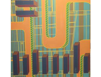 This is one painting in a series that explores the creation of space through the use of multiple flat layers. It is the artists hope that his paintings construct a rich evocative visual experience. "Lines Project 15" creates complexity as well as visual harmony using line, shape and color.