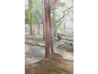 This is a painting done after a trip to Elk Lake; The artist was trying to find areas that didn't look like the typical Kansas landscape. It hsa two very detailed trees in the foreground, flanked on both sides by scenery that extends into the background.
