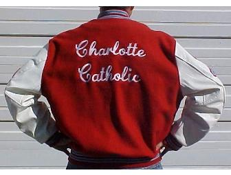 This red letterman jacket comes with white vinyl sleeves (size XL). It features Charlotte Catholic embroidered on the back, knit cuffs and waist, and standard snap closures. HIP HIP HOORAY -- bid on your jacket today!