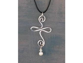 The Presence Cross is a joyful design inspired by the celebration of God's presence in our lives. Handcrafted with sterling silver wire, also has a pearl bead dangle. Comes on a sterling silver chain. Height: 1 1/4 - 1 1/2".