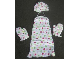The Little Cook Polka Dots Chefware. Set includes: apron, chef's hat and two oven mitts sized just for kids.