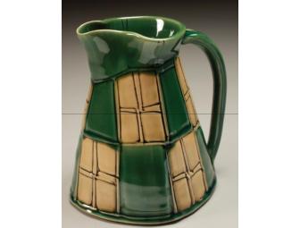Green and yellow, 7"x8" hand-thrown pitcher fired in an electric kiln to cone 6 with an iron yellow and copper green glaze.