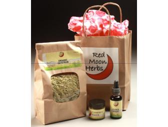 Includes Red Moon Herbs 8oz bag of organic oatstraw, 1 fluid oz/30ml of Elder Berry, 1oz of comfrey salve, instructions and a 20th anniversary catalog.