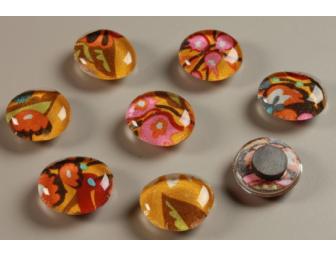 Eight handmade magnets from Home Sewn Goods - Select cuts of Anna Maria Horner's "Innocent Crush" fabric line are placed behind flat, 1.25 inch marbles, with 1/2 inch magnet affixed.