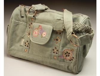 Mudd sage green fabric handbag with flower embroidery and two braided handles. Approximately 10" wide and 7" deep.