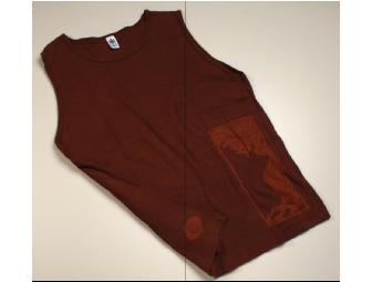 t-shirt block printed (hand-carved wood block, original design) bonsai/twisted tree print on brown, sleeveless XL size Classic Girl 100% cotton t-shirt.
