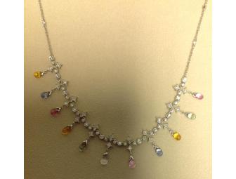 This vintage-inspired necklace from Parade Design features one carat of brilliant diamonds and eleven dazzling briolette sapphires in a rainbow of pastel colors set in 18k white gold on a 16 inch chain.