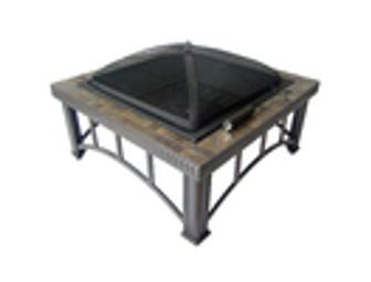 You'll love the ambiance created with your new outdoor fireplace. Now you can use your patio earlier in the spring and later in the fall with the warmth given off by this fire pit. It's 30 inches square and has a natural slate tabletop with decorative trim. The durable steel construction has a rubbed bronze finish. Included are a mesh spark guard, wood grate, poker and cover.